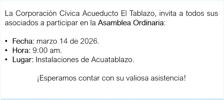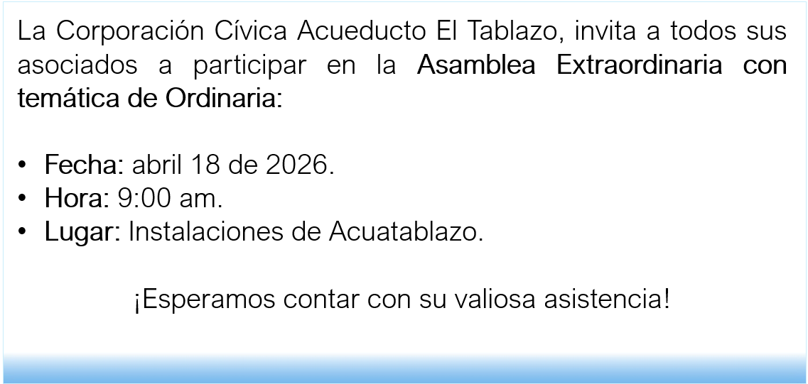 En la actualidad, la razón social del acueducto es CORPORACIÓN CÍVICA ACUEDUCTO EL TABLAZO –ACUATABLAZO.
